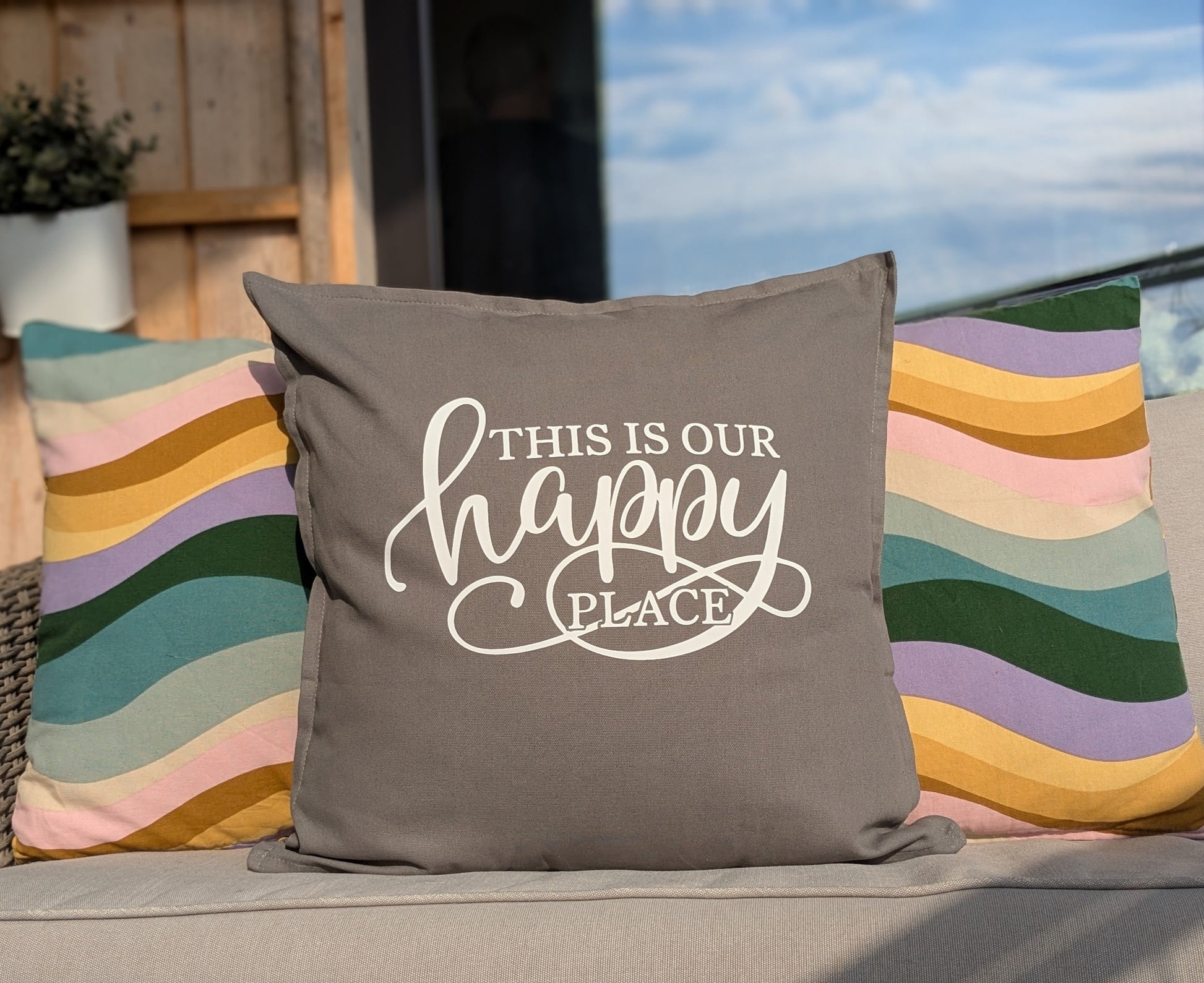 Ett grått kuddfodral av 100% bomull med texten "This is our happy place" med vita bokstäver.