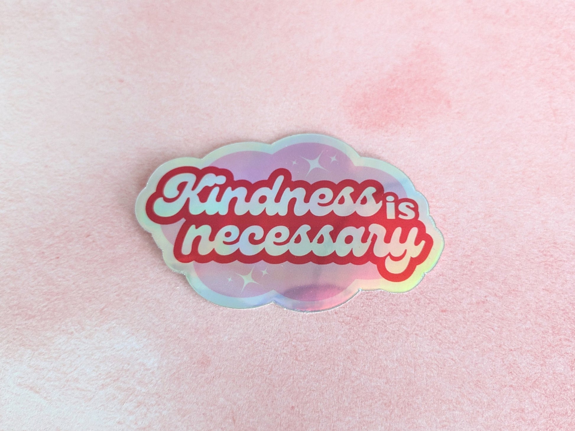 Ett relativt stort (mått nedan) klistermärke med det nödvändiga budskapet "Kindness is Necessary". Den holografiska effekten gör att med lite ljusskifte och annat perspektiv så ändras färgerna.